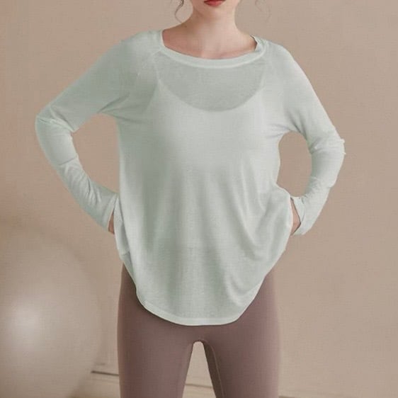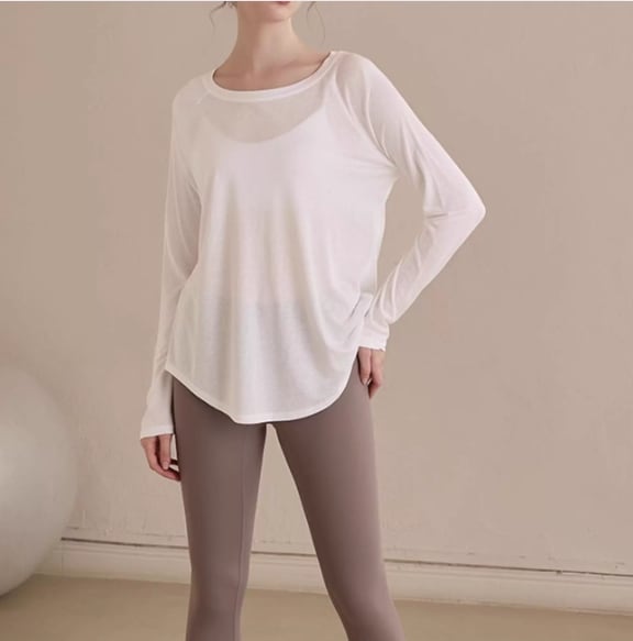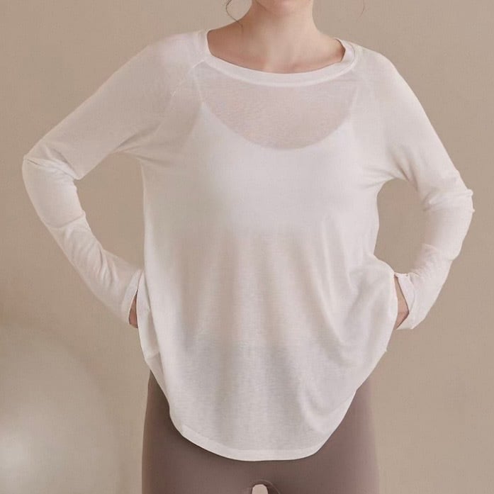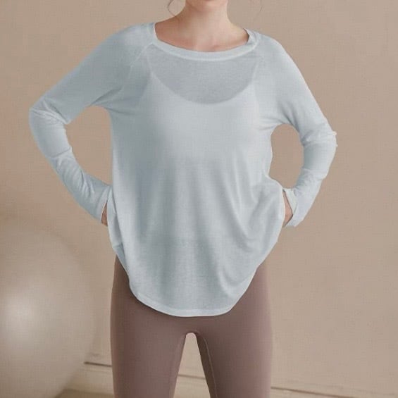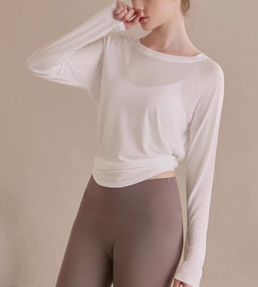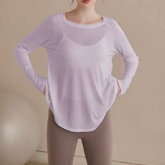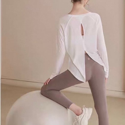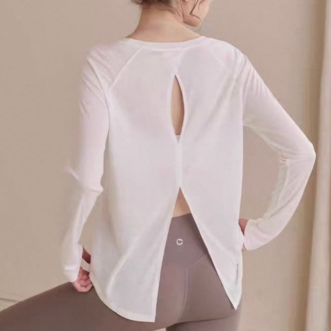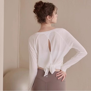 バックオープンスタイルが特徴的な長袖カットソー。ヒップ丈なので、気になる部分をカバーしつつ、スタイルアップ効果も期待できます。カジュアルな普段使いはもちろん、ヨガやピラティスなどのアクティブシーンにもおすすめです。