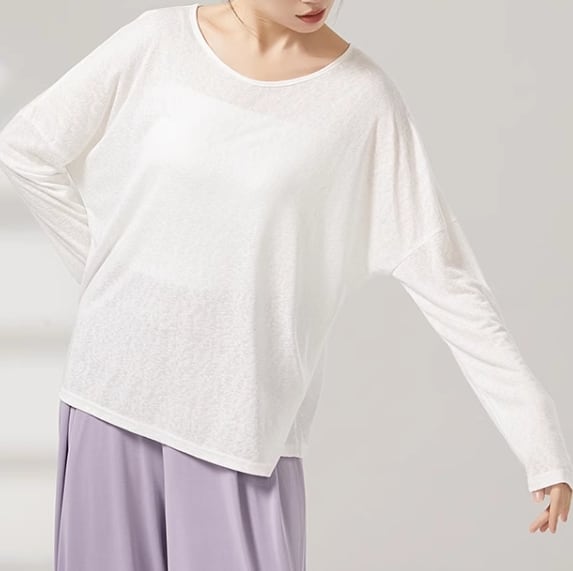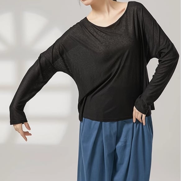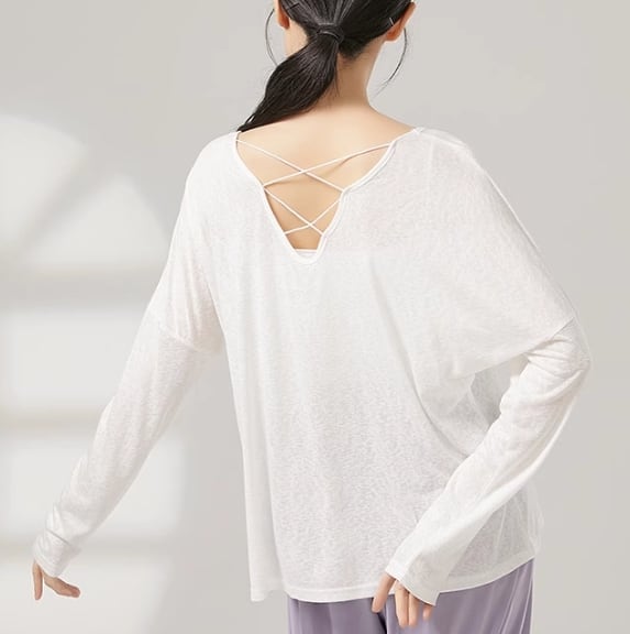 バッククロスのデザインが目を引く長袖カットソー。ヒップ丈なので、気になる部分をカバーしつつ、スタイルアップ効果も期待できます。普段使いはもちろん、ダンスやヨガなどのアクティブシーンにもおすすめです。