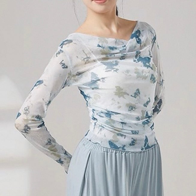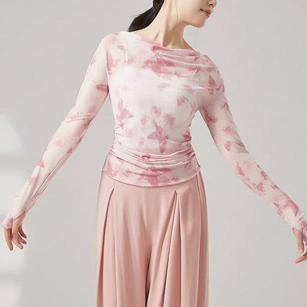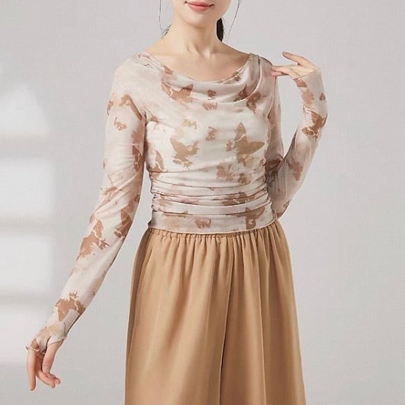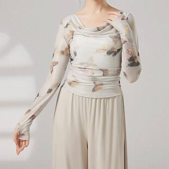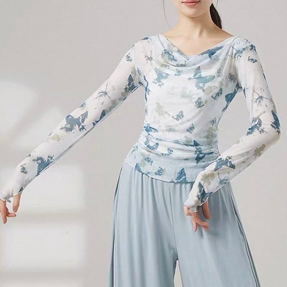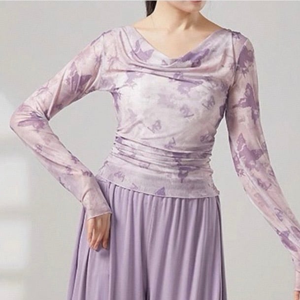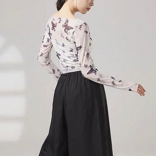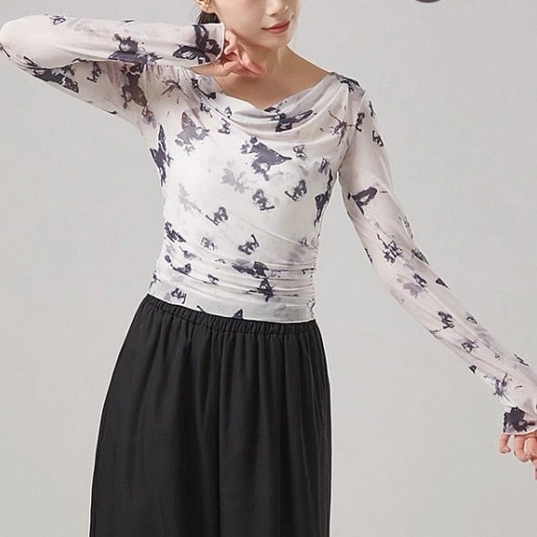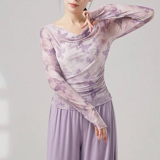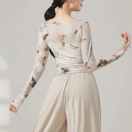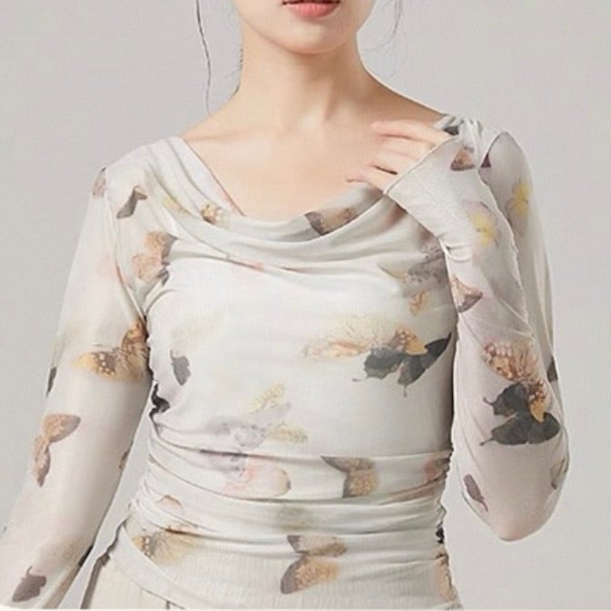 透け感が魅力的な長袖カットソー。蝶柄が上品な印象を与えます。普段使いはもちろん、ダンスやヨガなどのアクティブなシーンにもおすすめです。軽やかな着心地で、動きやすさをサポートします。