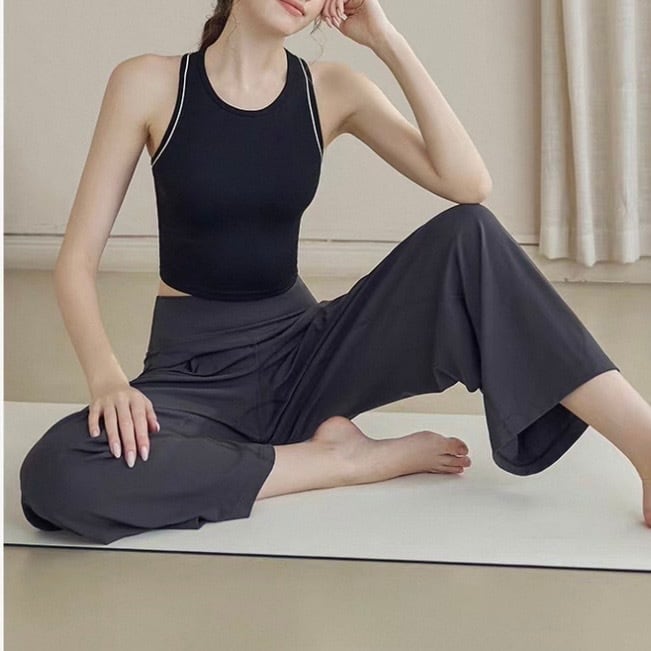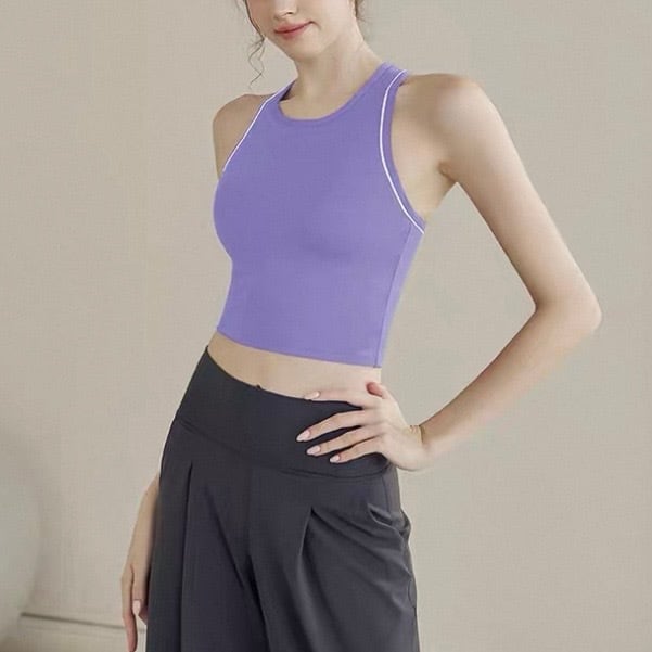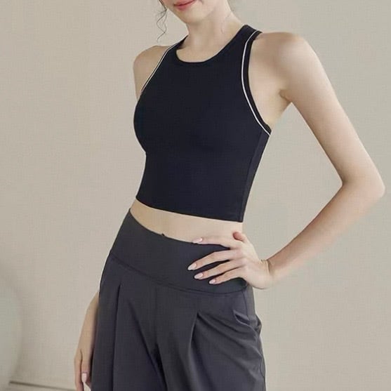 すっきりとしたシルエットが魅力のクロップド丈ノースリーブタンクトップ。配色パイピングがデザインのアクセントとなり、シンプルながらも洗練された印象を与えます。ヨガやトレーニングなどのアクティブシーンはもちろん、カジュアルな普段使いにもおすすめです。