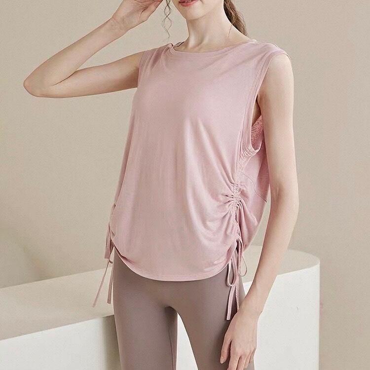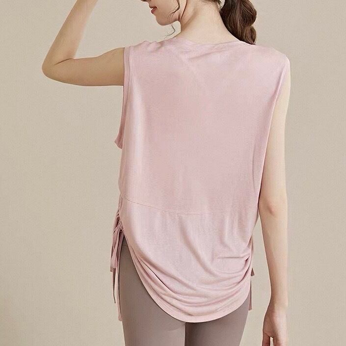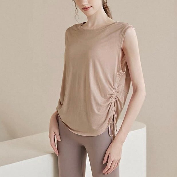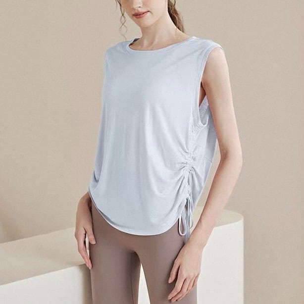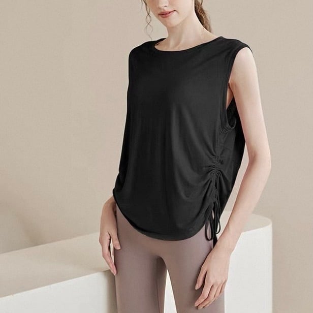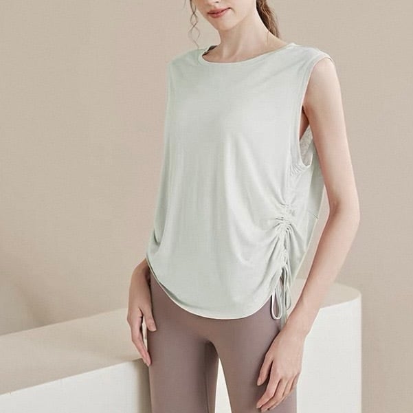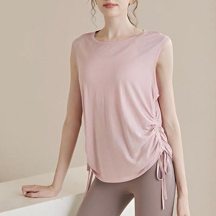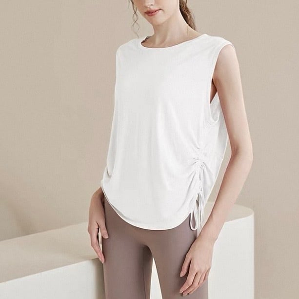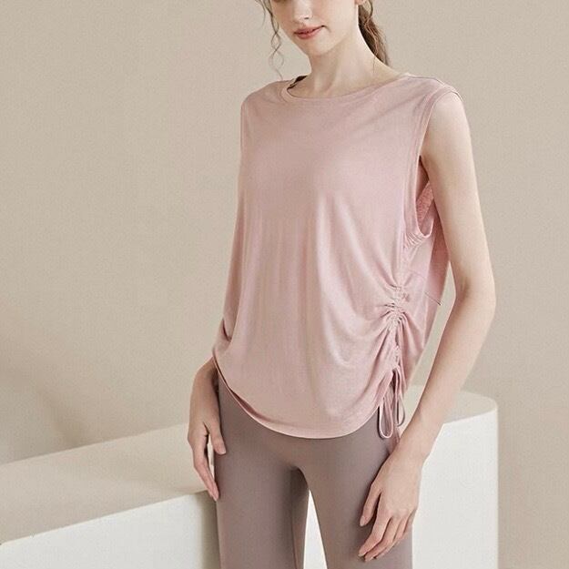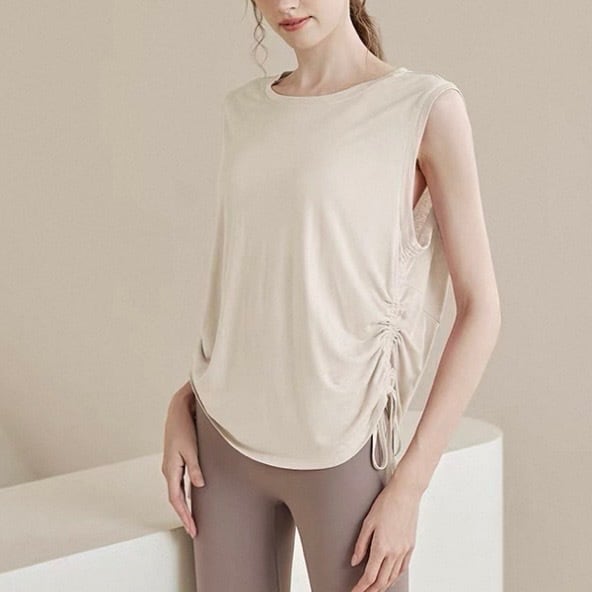 ドローストリングがアクセントのノースリーブカットソー。ヒップ丈なので、体型カバーにも役立ちます。カジュアルな普段使いはもちろん、ヨガやピラティスなどの軽い運動にもおすすめです。