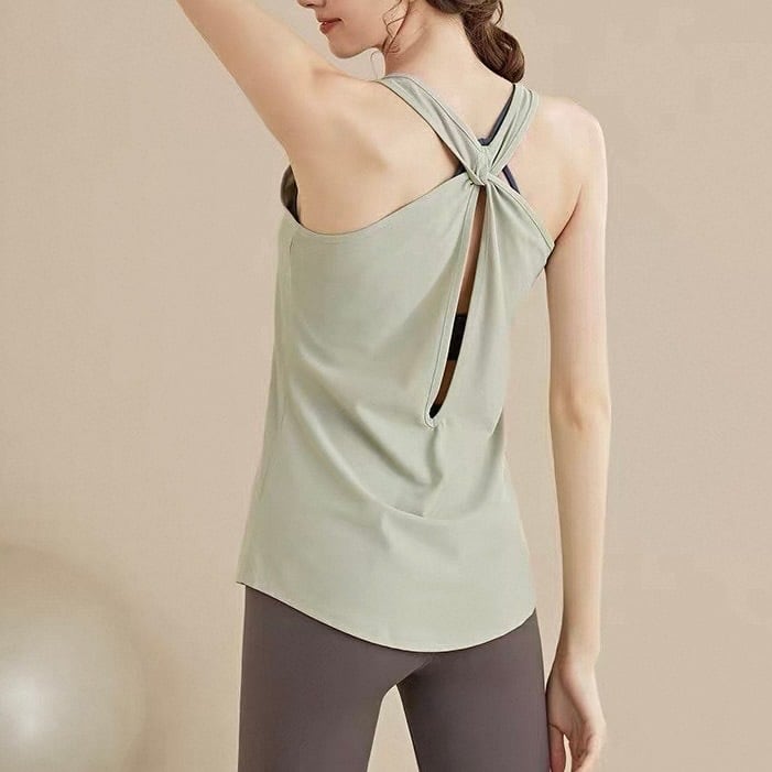 バッククロスのデザインが特徴的なヒップ丈タンクトップ。