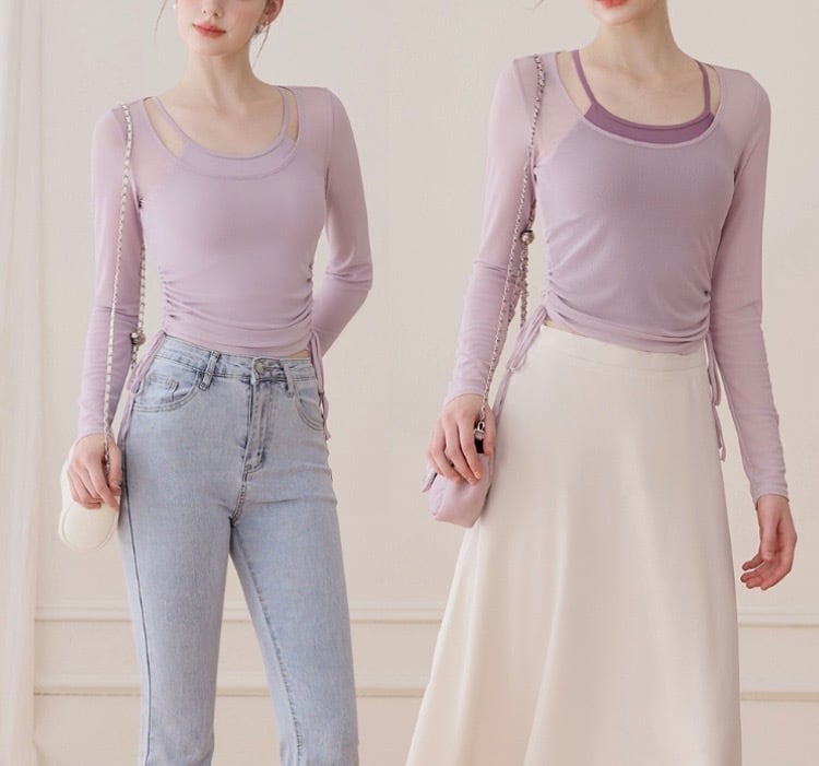 ドローストリング 長袖 シアー カットソー タンクトップ セット 2カラー 00125
